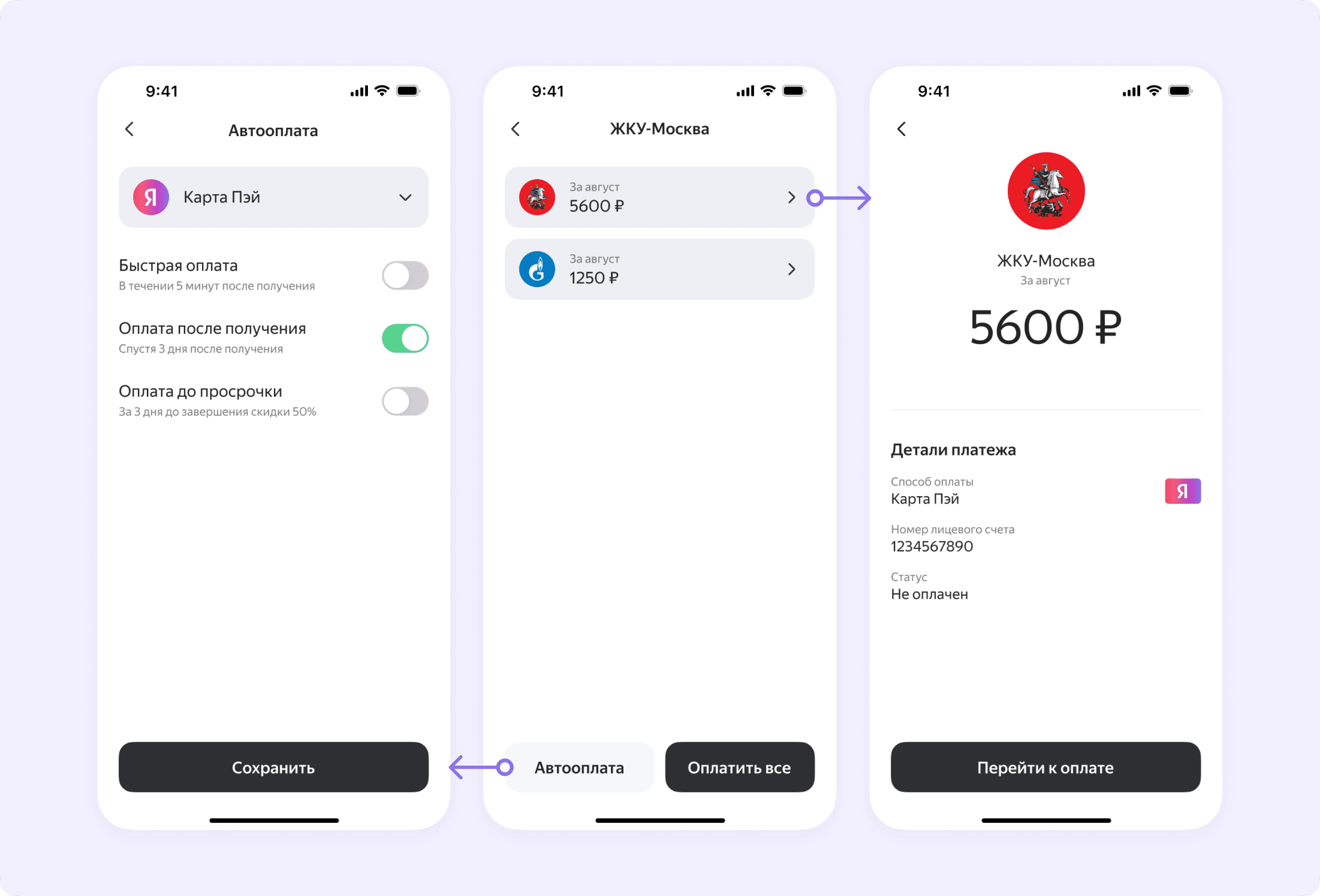 Спроектировать сценарии, которые позволят пользователю один раз настроить все регулярные платежи — за ЖКХ, штрафы, связь и другие услуги и удобно управлять ими в одном месте.