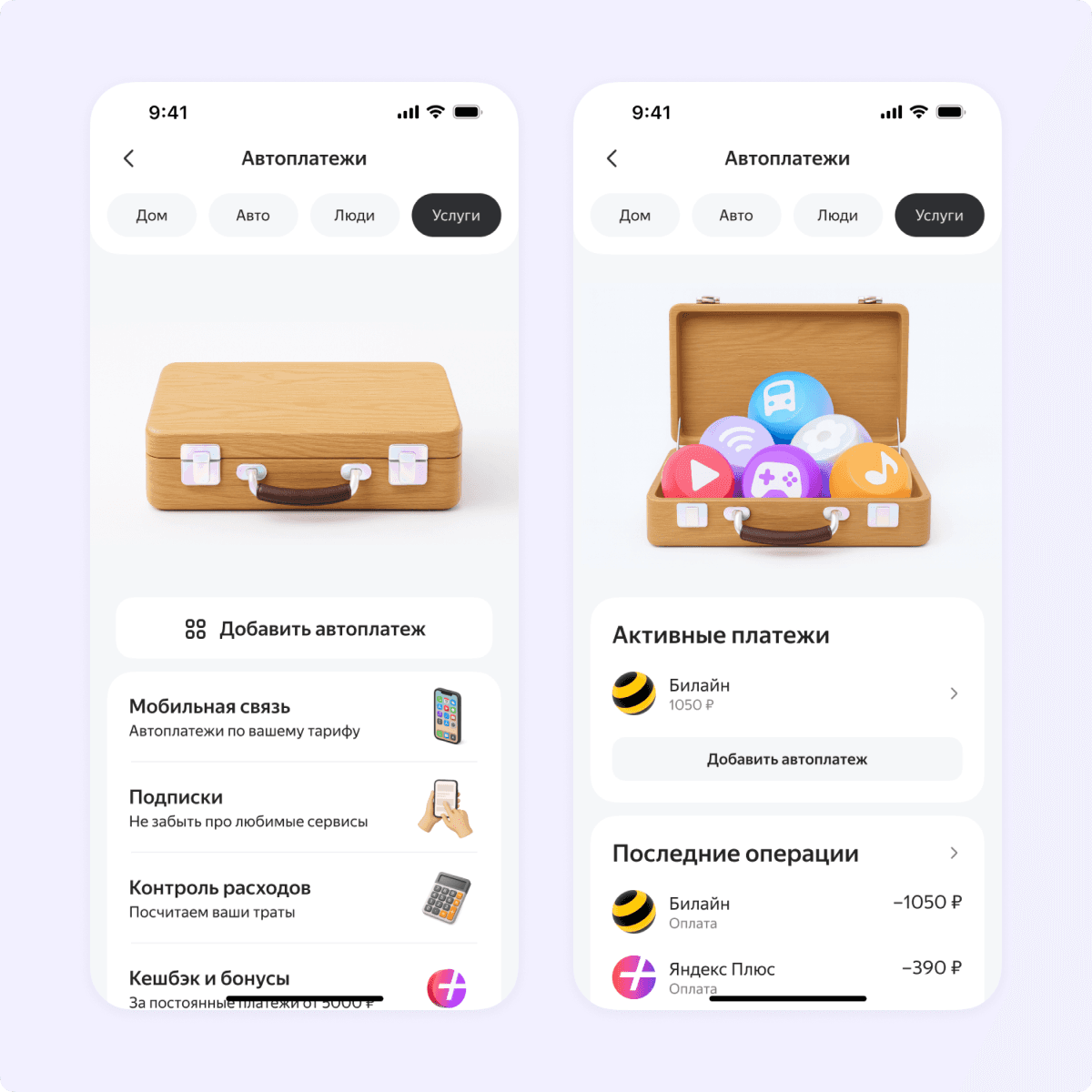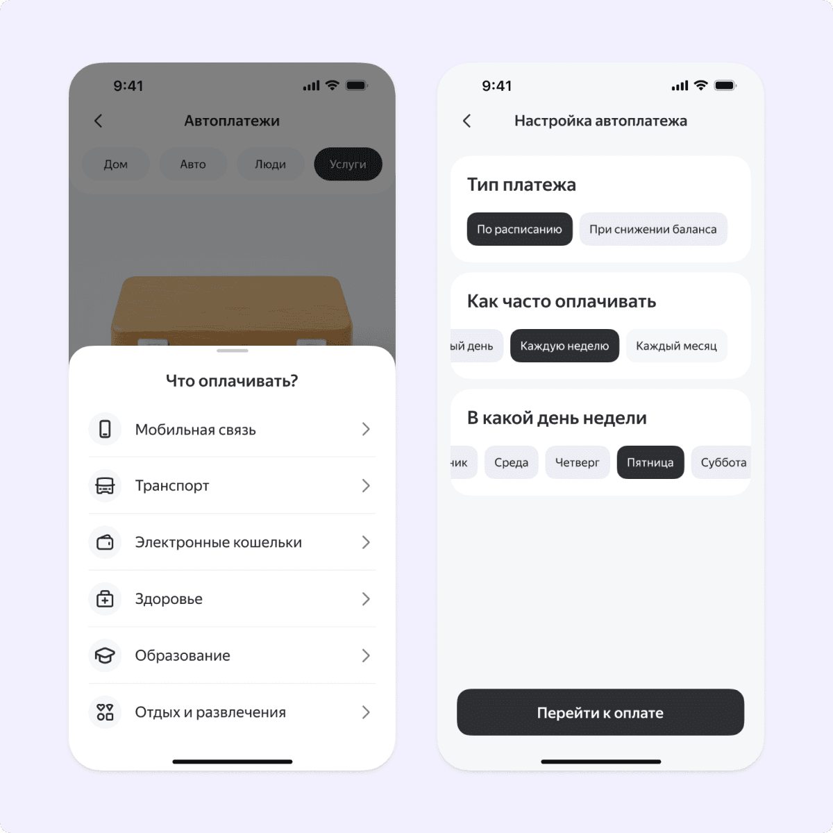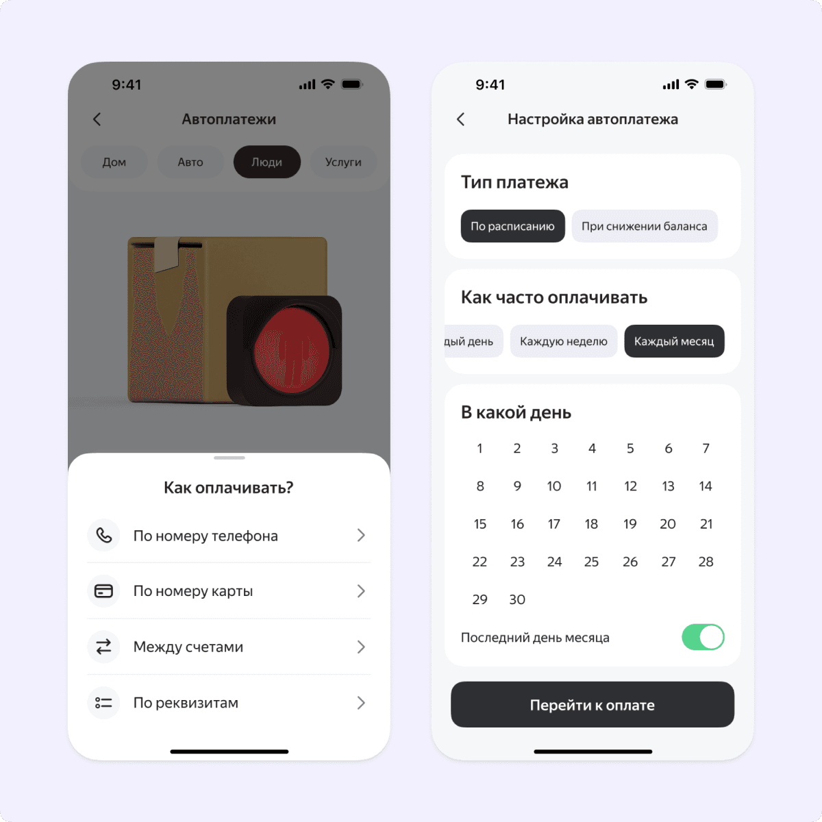 Раздел автооплаты для штрафов и услуг ЖКХ с гибкими настройками времени списания повысит доверие к сервису и удобство пользования автоплатежами.