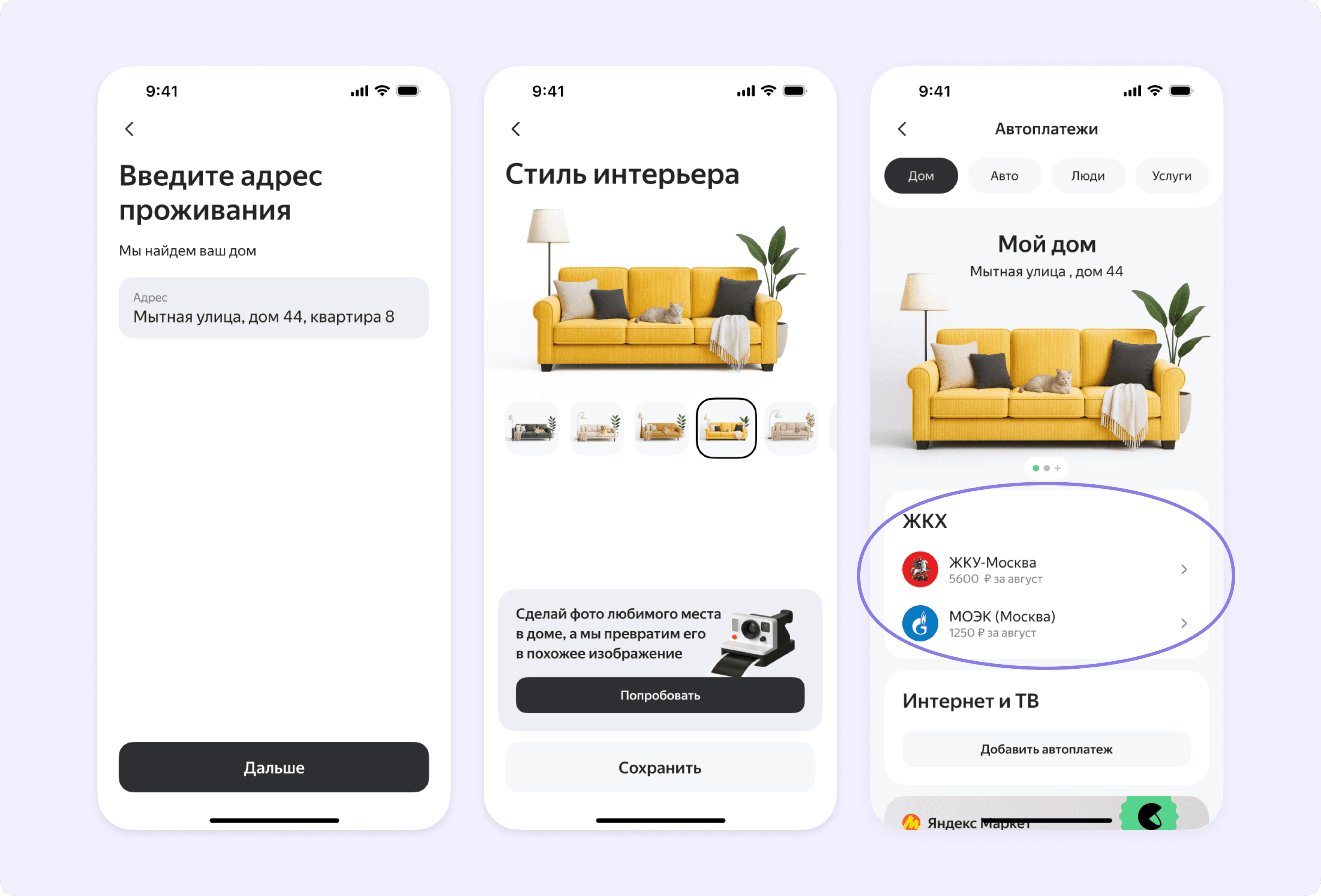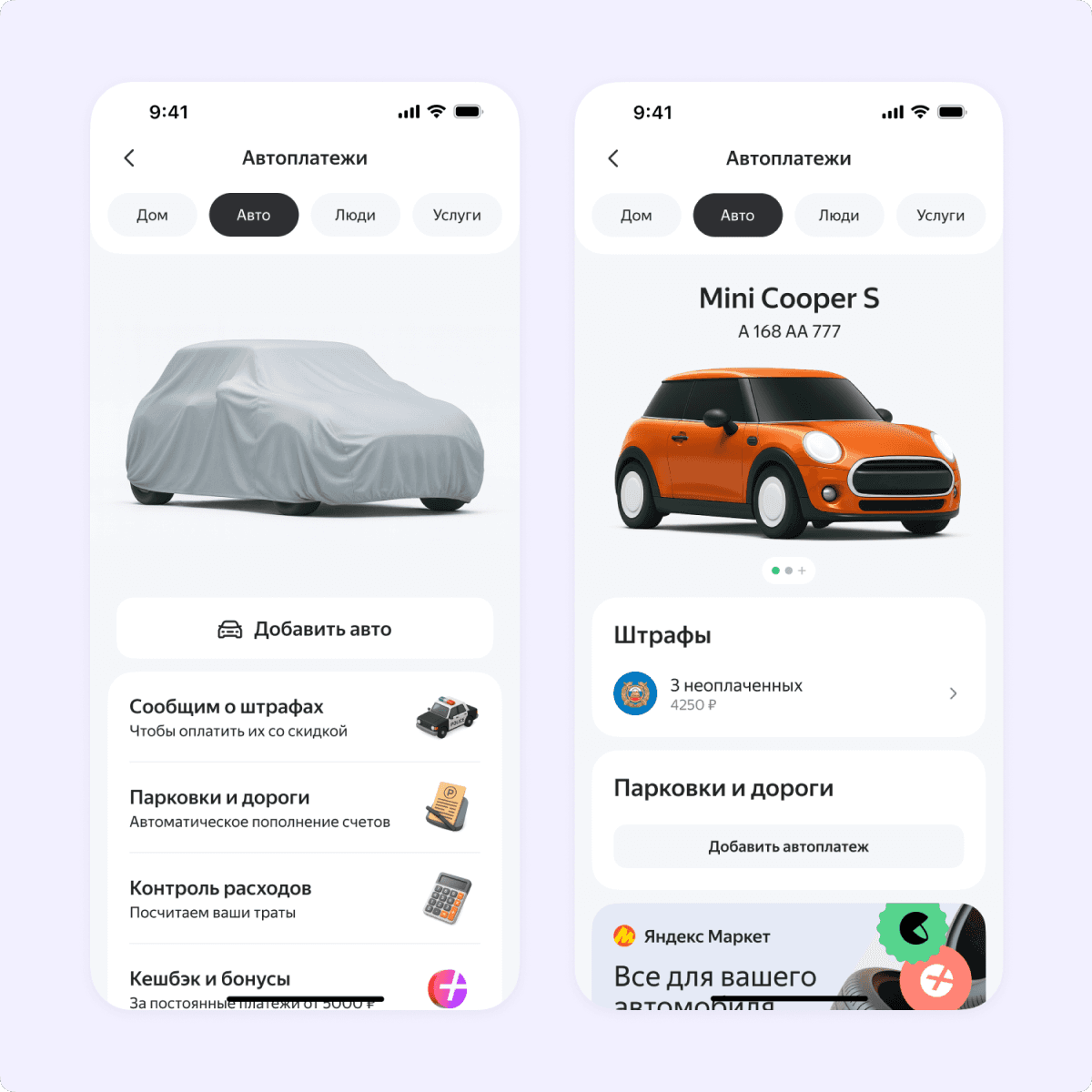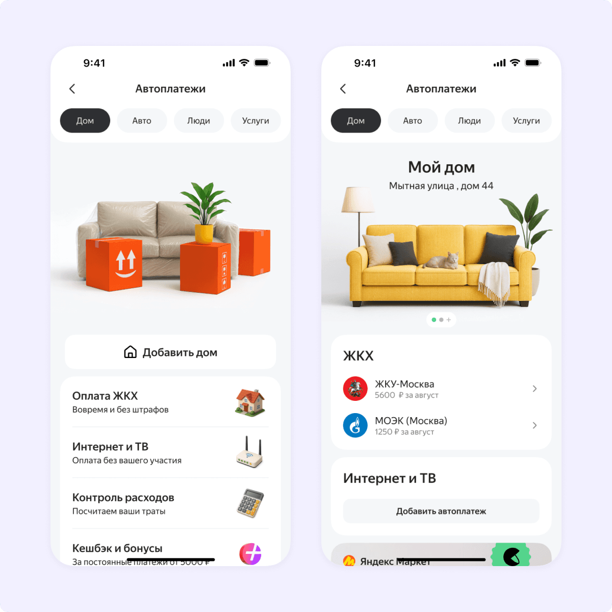 После добавления дома или авто, сервис сам определяет и предлагает связанные платежи, что сократить время настройки, и повысит доверия к «умному» сервису.